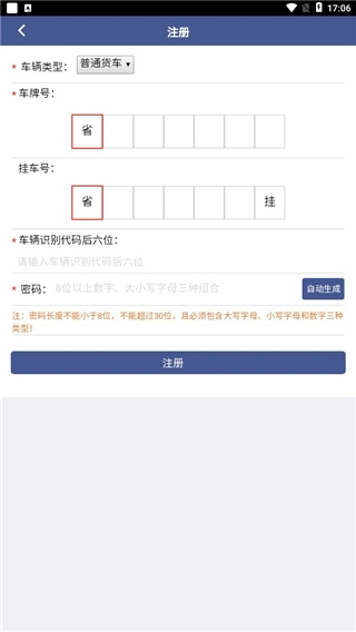 点击“简单注册”选项,用户仅需填写车牌号就能完成注册流程,无需上传驾驶证等相关照片材料;完成注册操作后,系统会自动跳转回登录页面,方便用户直接进行登录。