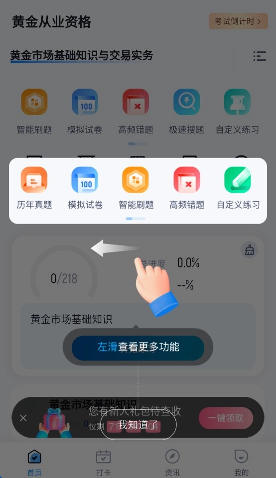 首页支持左右滑动操作,通过该操作可进入智能刷题、模拟试卷、自定义练习等功能模块。