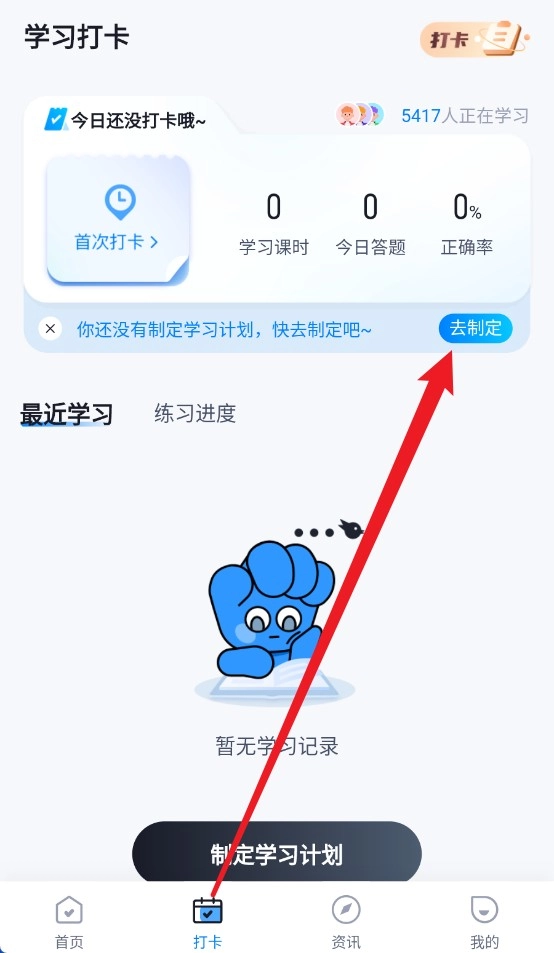 打卡页面支持制定学习计划,还能记录每日的答题数量以及准确率数据。