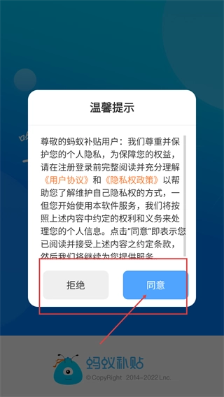 进入【蚂蚁补贴】后会弹出【温馨提示】,需要阅读【用户协议】与【隐私权政策】,点击【同意】按钮才能进入软件的后续界面。