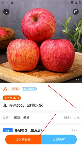3、进入【洛川苹果500g-(甜脆水多)】的商品详情页面,该商品支持使用【补贴金抵扣】,您可以根据需求选择【加入购物车】或者【立即购买】这两个操作选项。