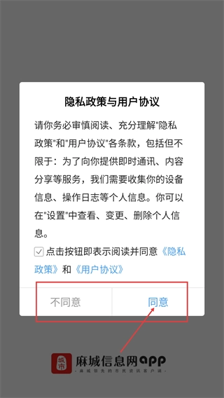 1、界面会展示《隐私政策》和《用户协议》,用户需要点击【同意】按钮,方可继续使用【麻城信息网-】的相关功能。