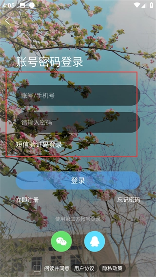 3、进入【账号密码登录】界面后,既可以填写【账号/手机号】和【请输入密码】进行登录,也可以切换到【短信验证码登录】方式。