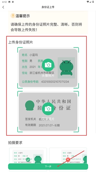 4、进入身份证上传页面后,按照要求上传完整且清晰的身份证照片,确认信息无误后点击【下一步】按钮,即可完成上传操作。