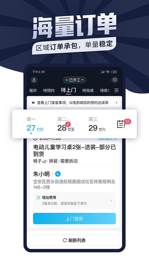 2.高效便捷的订单与日程管理:内置清晰的订单管理日历,帮助师傅直观规划每日行程与路线,有效提升服务效率和时间利用率,实现工作日程的便捷化管理。