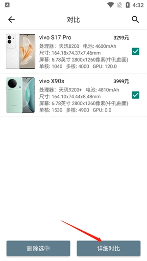 若要进行手机对比,需先挑选两款手机添加至对比列表,接着点击进入对比界面,勾选已选的这两款手机,最后点击界面下方的详细对比按钮即可。