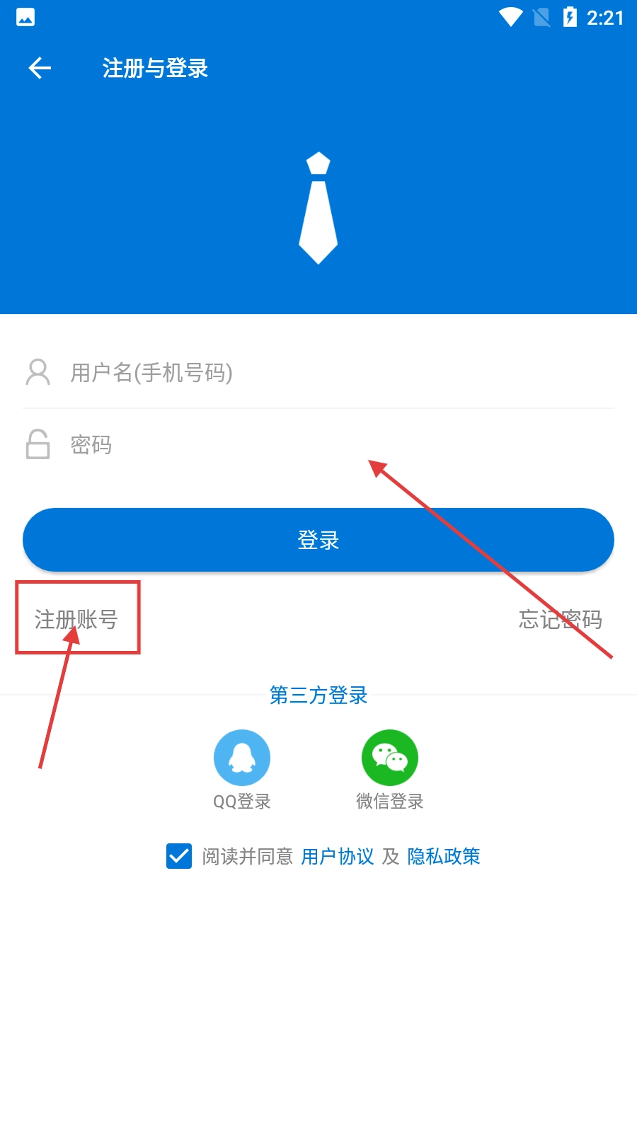 在注册与登录页面,点击【注册账号】按钮,即可进入手机注册的流程。