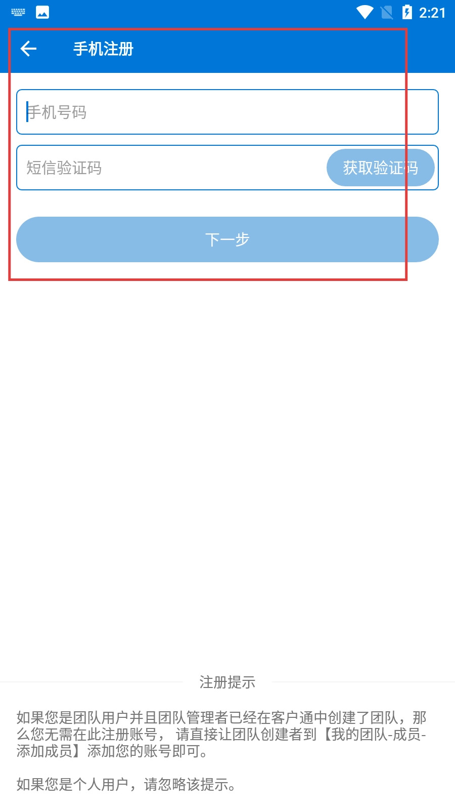 在手机注册的界面中,先填写手机号码,接着点击【获取验证码】按钮并输入收到的验证码,之后点击【下一步】按钮即可。