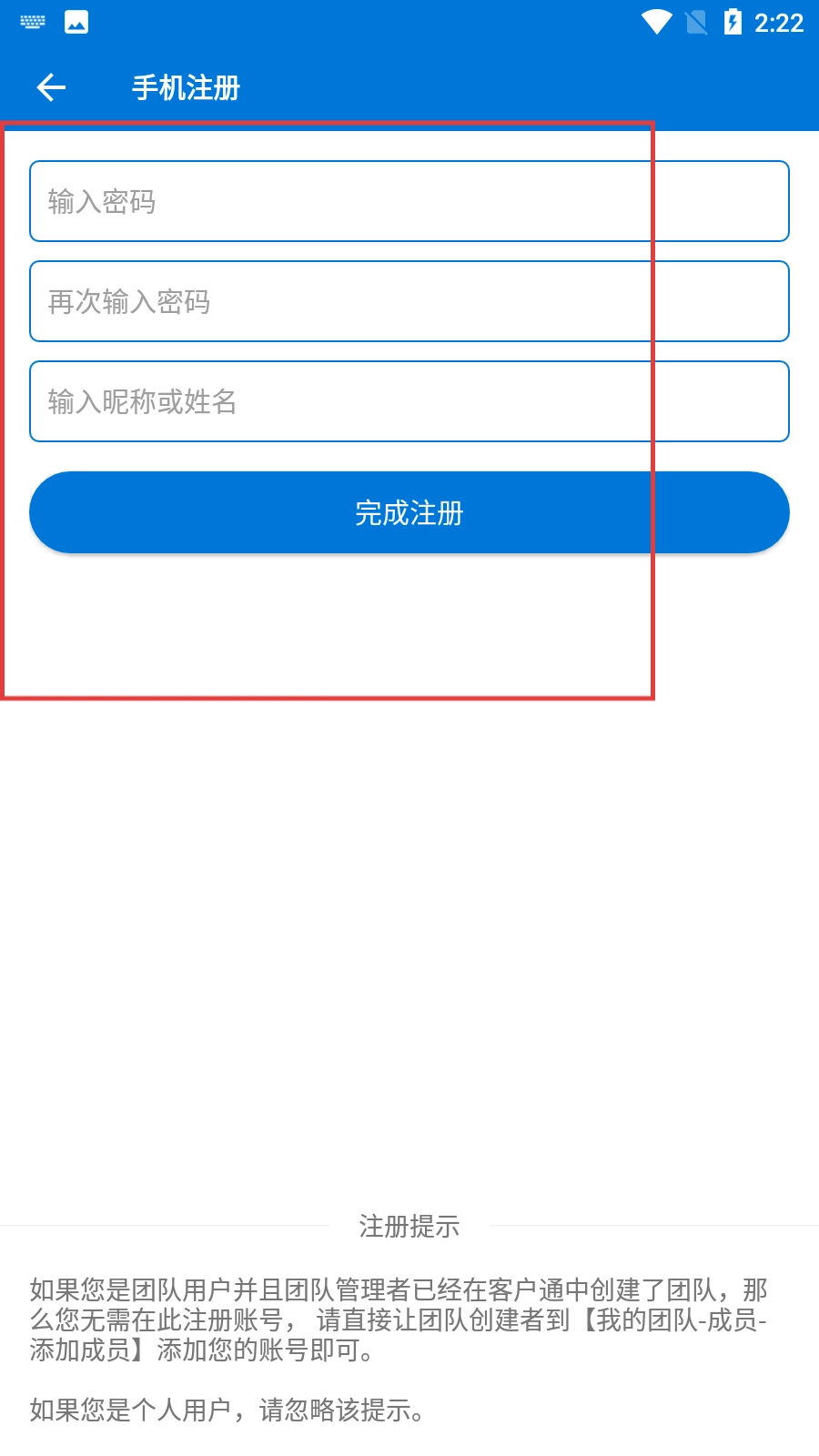依次输入密码、重复输入密码以及昵称或姓名,随后点击【完成注册】按钮,即可完成账号注册流程。