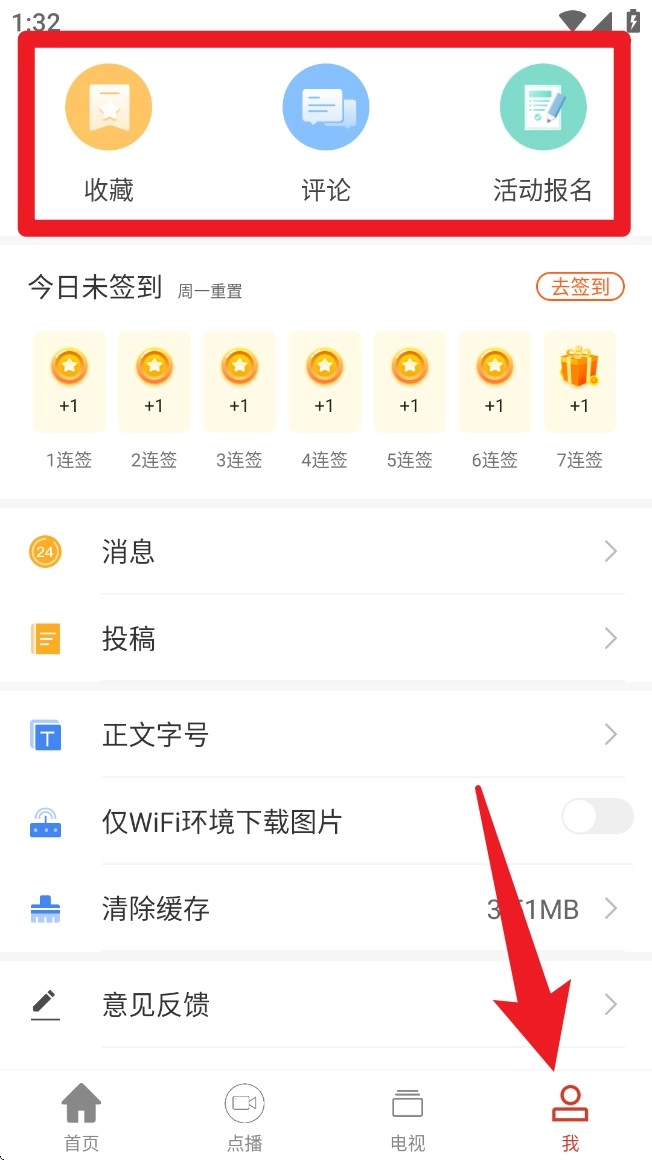 点击底部的「我」栏目进入个人中心,就能查看收藏、评论与报名记录,还可以完成签到、清理缓存等操作。