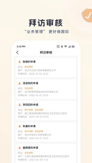 拜访审核页面呈现所有客户拜访申请,可查看异常标记详情,助力管理人员高效开展审批工作。