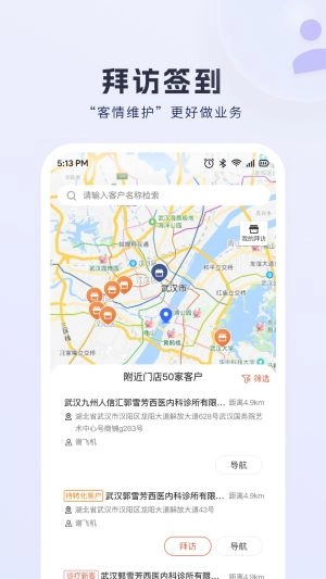 拜访签到界面整合地图功能,可直观呈现周边客户的具体位置,同时具备导航与签到功能,能帮助业务员更精准高效地完成拜访任务。