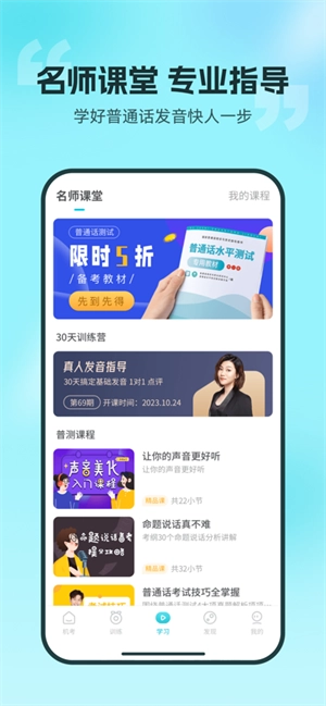 为你精准推荐适配的学习课程,还配备了普通话视频教学资源,能帮你省去不必要的学习环节,让普通话学习效率提升80%。