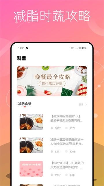 减脂食谱:为用户提供各类健康减脂减肥食谱,方便用户获取所需的食谱参考内容。