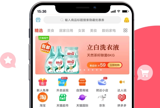 用户可在软件内领取各大电商平台的优惠券,并于购物时使用。