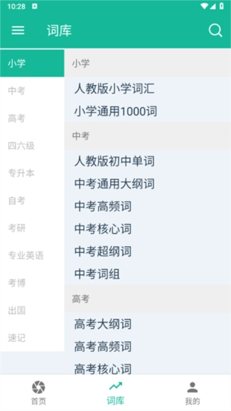 词库覆盖范围全面,涵盖小学、中考、高考、大学四级、大学六级、考研、自考、专升本、考博、托福、GRE、雅思等各类考试词库,以及自然拼读、复合词、词根词缀、高频词等专项学习词库。