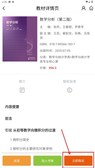在教材详情页面,点击“立即购买”按钮,即可完成教材的购买操作。