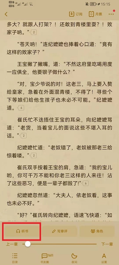 在小说阅读界面,轻点屏幕中间区域即可调出阅读设置功能;待设置界面弹出后,点击左下角的【听书】按钮,就能进入听书功能页面。