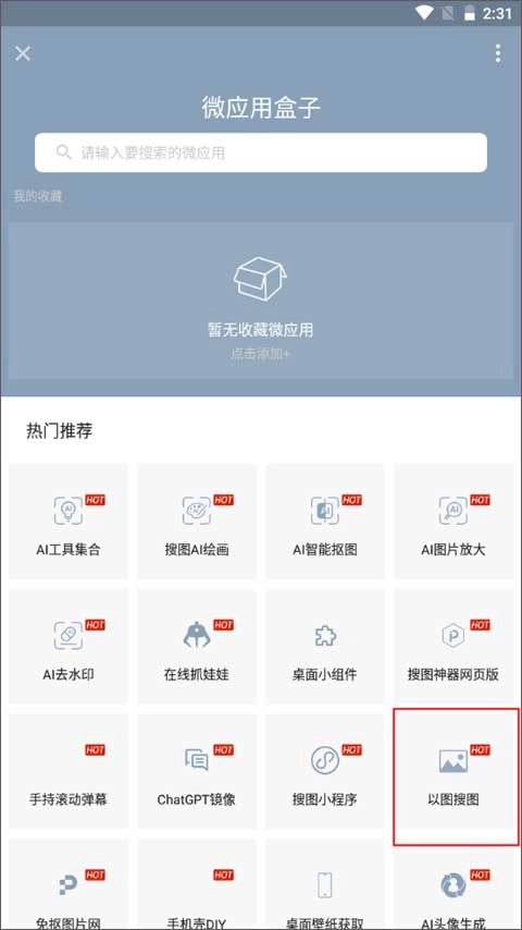 2、在微应用盒子里找到热门推荐区域,点击以图搜图的功能选项。