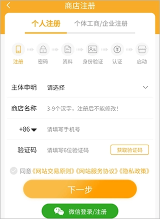 2、先选择个人或商户类型,接着选择主体申明选项,输入商店名称、手机号并填写验证码后,点击下一步,按照页面提示完成后续操作就能成功开店了。