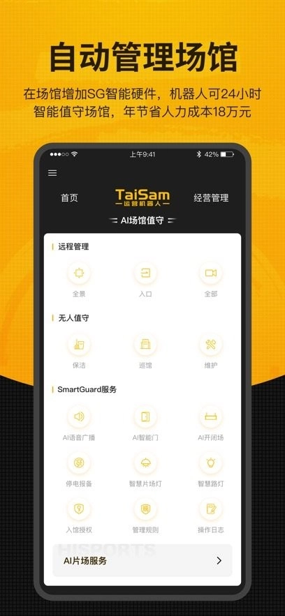 平台支持场馆自动管理:通过投放SG智能硬件工程,搭配可依托SG系统24小时值守的机器人,助力场馆升级为全天候无人值守的智能场馆,每年可节省人力成本18万元。