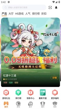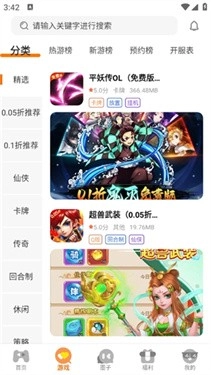 2、分类栏目为你呈现精选游戏、折扣游戏,还有传奇、仙侠、回合制、策略等各类游戏主题。