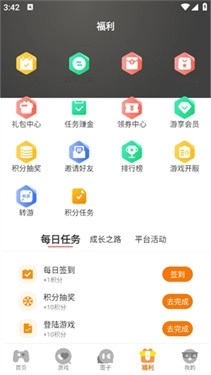 4、海量游戏礼包待你领取,每日签到、积分抽奖、登录、充值、设置头像、完善信息等多种方式均可获取积分。