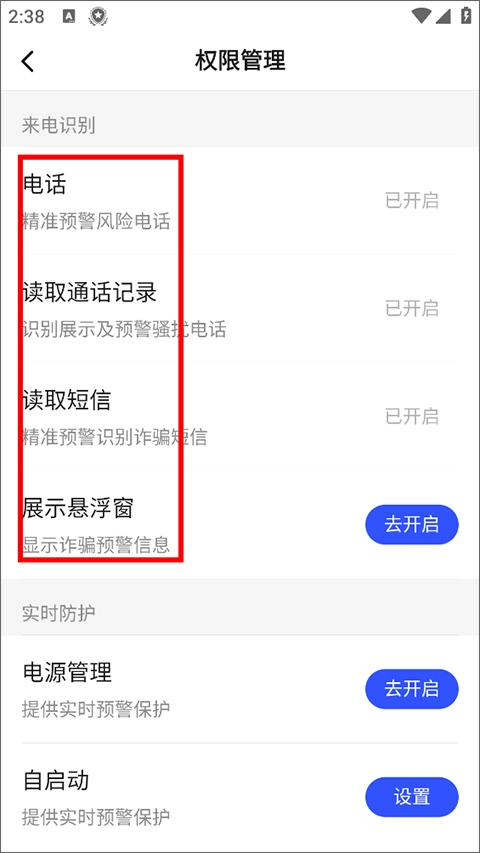 2. 用户若要进入权限管理页面,需开启电话、短信、通话记录、悬浮窗等权限。