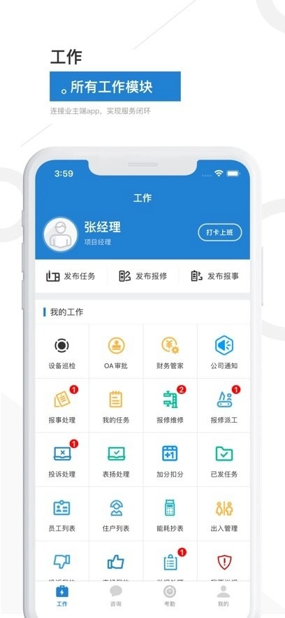 是支持所有工作模块的物业服务软件,连接之后可以直接与业主进行兑换,帮助业主解决问题。员工列表以及住户列表非常清晰详细,查询员工或者住户更加便捷。