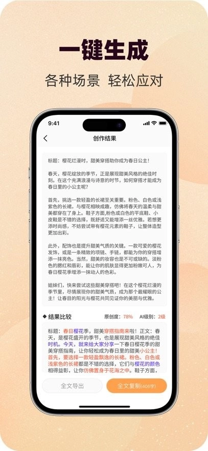 是一键生成的写作工具,可以根据自己的需求,选择不同风格的文章。用户只需输入关键字和主题,应用即可根据这些信息生成文章。