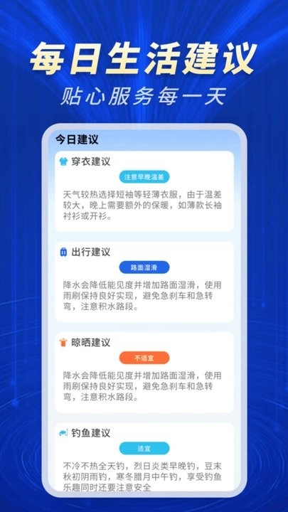 4. 每天会依据天气情况,为你量身打造贴心的生活小贴士。天冷时提醒你及时增添衣物、注意保暖;高温天气则建议做好防晒防护……从多方面守护你的生活健康与舒适体验。
