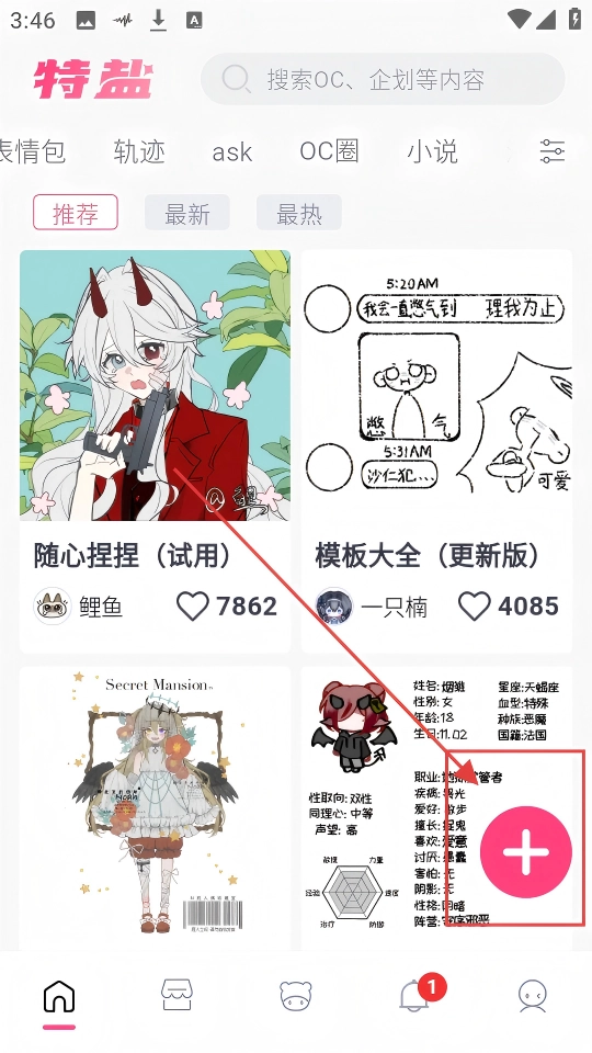 在特盐首页,点击右下角那个粉色的加号按钮,就能展开创作选项,开启你的世界观创建之旅啦。