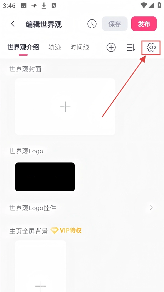 进入后,在世界观编辑页面,点击右上角的齿轮设置按钮,即可展开设置选项。