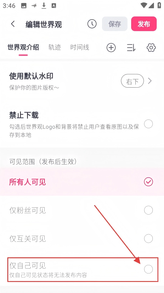 在设置选项中,要是希望世界观仅自己可见,只需勾选【仅自己可见】这个选项,如此一来就设置完成了。