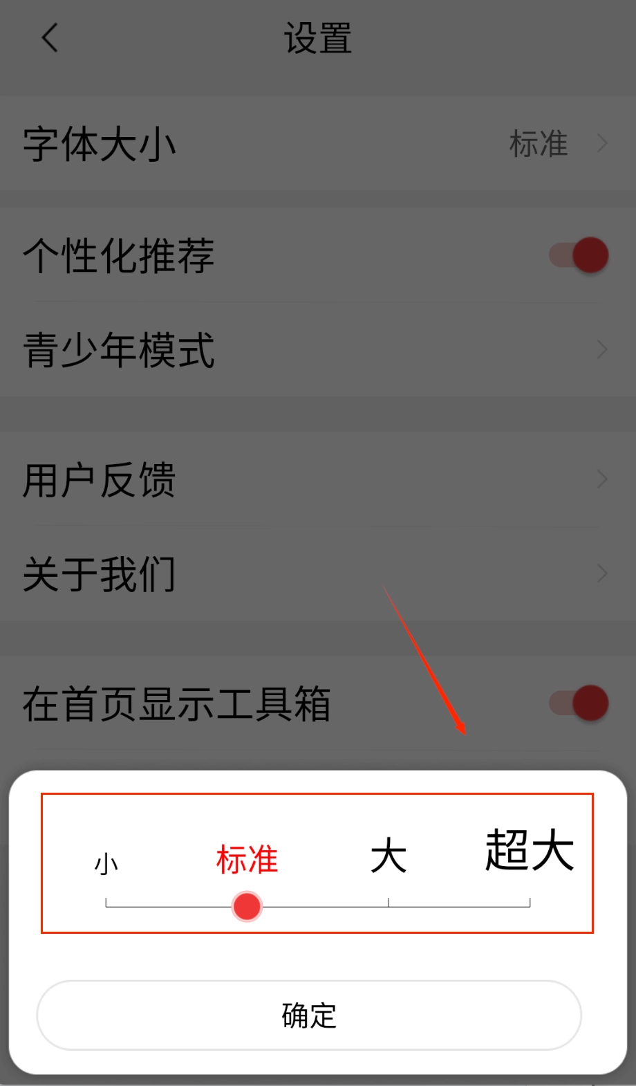 左右滑动调节条就能实时看到不同字号的显示效果,选中标注有“超大”字样的字体模式后,点击确认按钮就能把当前的设置保存下来。