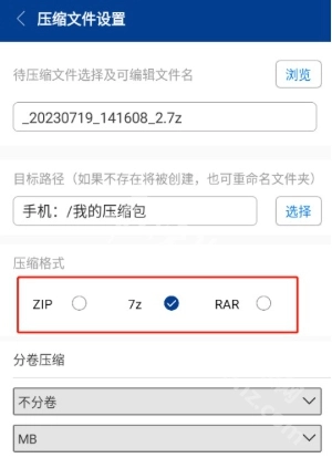 在压缩格式选择后缀名,如7z,滑动确认完成压缩。