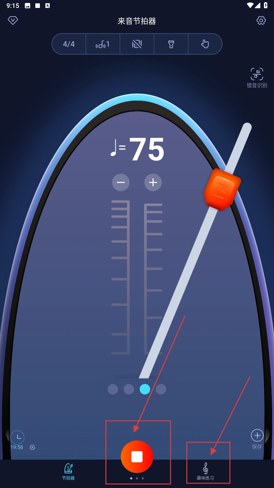 点击【开始/停止】按钮可控制节拍器的运行状态,之后点击【趣味练习】,即可进入对应的练习模块。