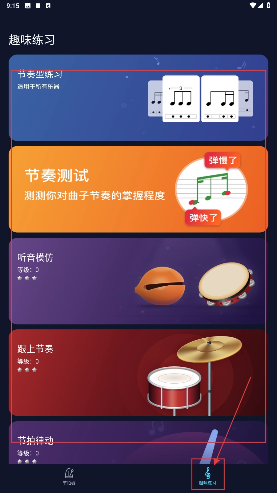 在趣味练习页面,挑选练习类别(如节奏型练习、节奏测试等),就能开展音乐节奏的练习了。