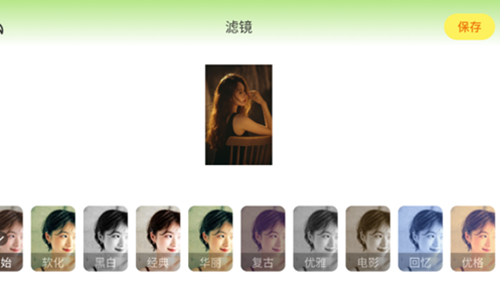 3、在编辑界面的下方可看到众多不同的滤镜,选择到满意的滤镜后点击右上角保存按钮即可完成。