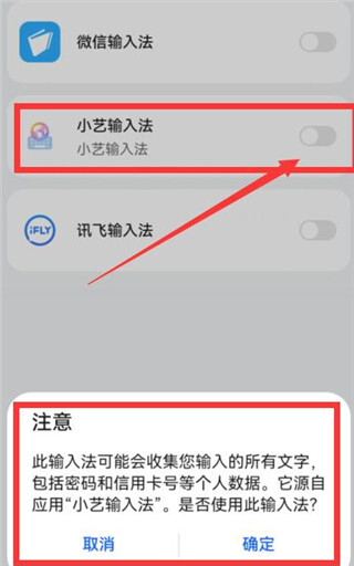 3、无需理会其他,直接点击“确定”。接着在下图中,选中“小艺输入法”,将其设为默认输入法(其实也能够在手机设置的“系统和更新”中的“语言和输入法”里,把它设置成默认)。