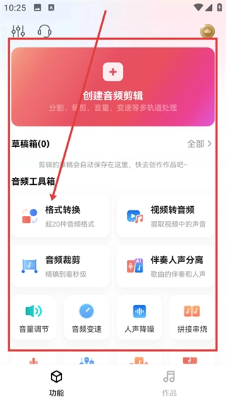 在功能页面找到【格式转换】工具并点击,即可进入音频格式转换的文件选择界面。