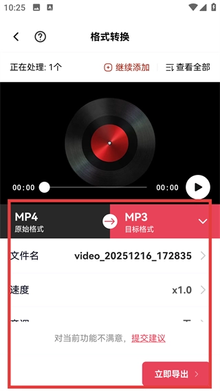 在格式转换页面选择原始格式与目标格式(例如【MP4】转换为【MP3】),完成设置后点击【立即导出】按钮,即可启动格式转换操作。