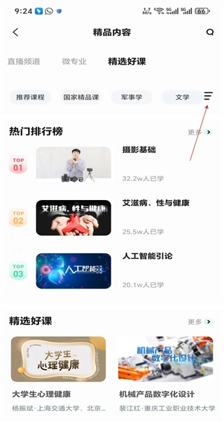 1、打开软件后,进入精选好课页面,看到热门排行榜及各类课程分类,找到分类切换按钮准备选择课程类别。