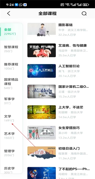 2、进入全部课程页面,左侧呈现全部智慧课程等分类列表,选择文学分类,右侧展示对应类别的多门课程可供挑选。