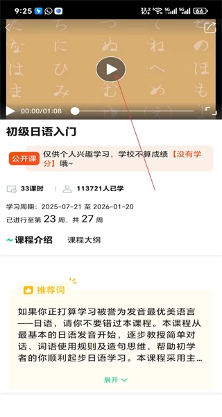 4、进入初级日语入门课程详情页,看到课程时长学习周期等信息,找到页面中的播放按钮,即可开始学习该课程内容。
