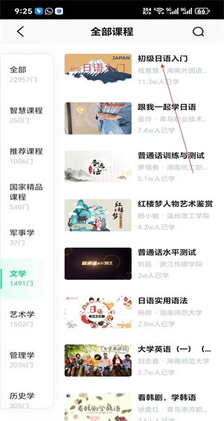 3、在文学分类的全部课程页面,浏览展示的课程列表,找到初级日语入门课程,准备进入该课程的详情页面。