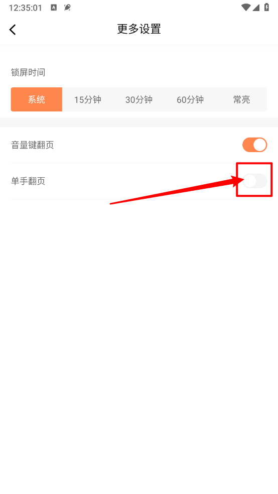 4、进入“更多设置”页面,找到并开启“单手翻页”的开关就可以了。