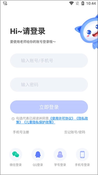 1、在本站点击安装并打开,选择微信、QQ、学号或手机号登录软件。