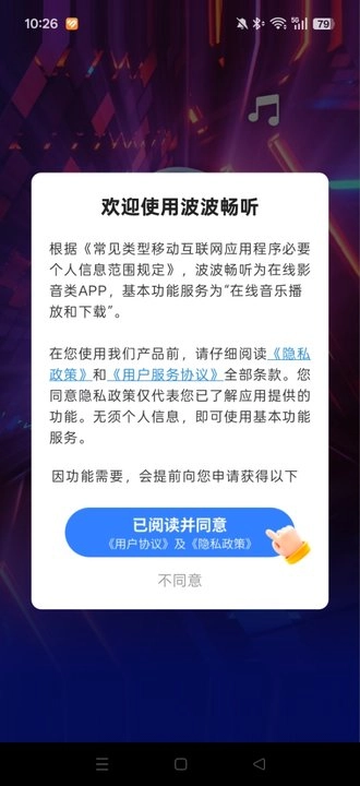 1、打开好的软件启动进入,完整阅读用户协议及隐私部分,点击已阅读并同意进入。