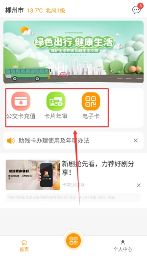 3、首页提供公交卡充值服务、卡片年度审验功能以及电子公交卡办理入口。